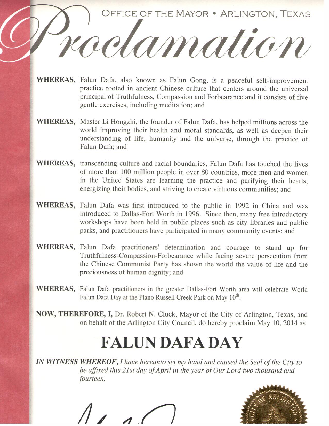 美国德克萨斯州阿灵顿市(Arlington)市长罗伯特•克拉克(Robert Cluck)宣布五月十日为法轮大法日,赞誉法轮功创始人李洪志先生所传的法轮大法改善了人们的身体健康并提升了他们的道德水准。 译文如下: 鉴于,法轮大法(又称法轮功)是起源于古老中国文化,以宇宙原理“真善忍”为准则的一个平和的自我提升的功法。法轮功共有包括打坐修炼在内的五套舒缓的功法; 鉴于,法轮大法的创始人李洪志大师,帮助了全世界上亿的人改善了身体健康、提升了道德水准,以及使他们通过修炼法轮功加深了对生命、人生、以及宇宙的认识; 鉴于,法轮大法超越文化和种族的界限,在全世界八十多个国家吸引了上亿的人修炼法轮功。在美国越来越多的人们通过学炼法轮功,使他们心灵得到净化,身体健康,并为社区道德的回升起着积极的作用; 鉴于,法轮大法从一九九二年在中国传出。一九九六年法轮大法弘传到达拉斯-福特沃斯地区。从那以后,在达福地区许多图书馆、公园举办了许多期免费法轮大法教功班。法轮大法修炼者参加了许许多多社区活动; 鉴于,面对中共的残酷迫害,法轮大法学员展现出的对“真、善、忍”的坚定信念,向全世界展示了生命的价值和人格的尊严; 鉴于,达拉斯-福特沃斯地区法轮大法学员在五月十日在布兰诺Russell Creek公园庆祝世界法轮大法日; 鉴此,我,罗伯特•克拉克,阿灵顿市(Arlington)市长,并代表市议会,宣布二零一四年五月十日为 法轮大法日罗伯特•克拉克(签字) 美国德州伯德福特市宣布法轮大法日