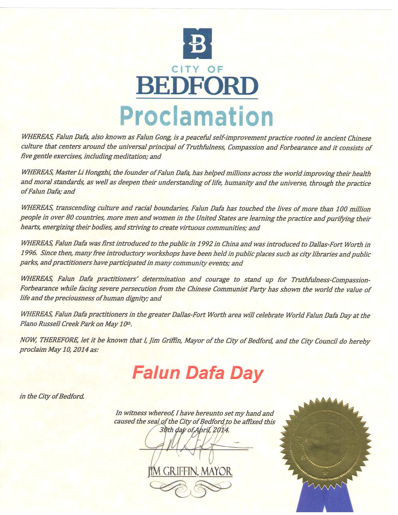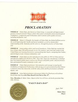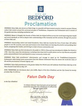 美国德州达拉斯-福特沃斯地区法轮功学员于二零一四年五月十日在布兰诺Russell Creek公园庆祝即将到来的世界法轮大法日,法轮大法弘传世界二十二周年。美国德克萨斯州伯德福特市(Bedford)市长吉姆•格里芬(Jim Griffin)宣布宣布五月十日为法轮大法日,褒奖法轮功对社区的贡献。 鉴于, 法轮大法(法轮功)源于古老中国文化,是以宇宙特性“真善忍”为原则的一个平和的自我提高的功法。法轮功共有五套功法,包括打坐修炼在内; 鉴于,法轮大法创始人李洪志先生帮助了全世界上亿人增强身心健康,以及使他们通过修炼法轮功加深了对生命、人生、以及宇宙的认识; 鉴于,法轮大法超越文化和种族的界限,在全世界八十多个国家吸引了上亿人们修炼法轮功。在美国越来越多的人们通过学习法轮功,使他们心灵得到纯净,身体健康,并为社区道德的回升起着积极的作用。 鉴于,法轮大法从一九九二年在中国传出。一九九六年法轮大法洪传到达拉斯-福特沃斯地区。从那以后,在达福地区许多图书馆,公园举办了许多期免费法轮大法教功班。(法轮大法修炼者)参加了许许多多社区活动; 鉴于,面对中共的残酷迫害,法轮大法学员展现出的对“真、善、忍”的坚定信念,向全世界展示了生命的价值和人格的尊严; 鉴于,达拉斯-福特沃斯地区法轮大法学员将在五月十日在布兰诺Russell Creek公园庆祝世界法轮大法日。 因此,我,吉姆•格里芬,伯德福特市市长及市议会,宣布二零一四年五月十日为 “法轮大法日” 美国德州弗瑞斯科市宣布法轮大法日