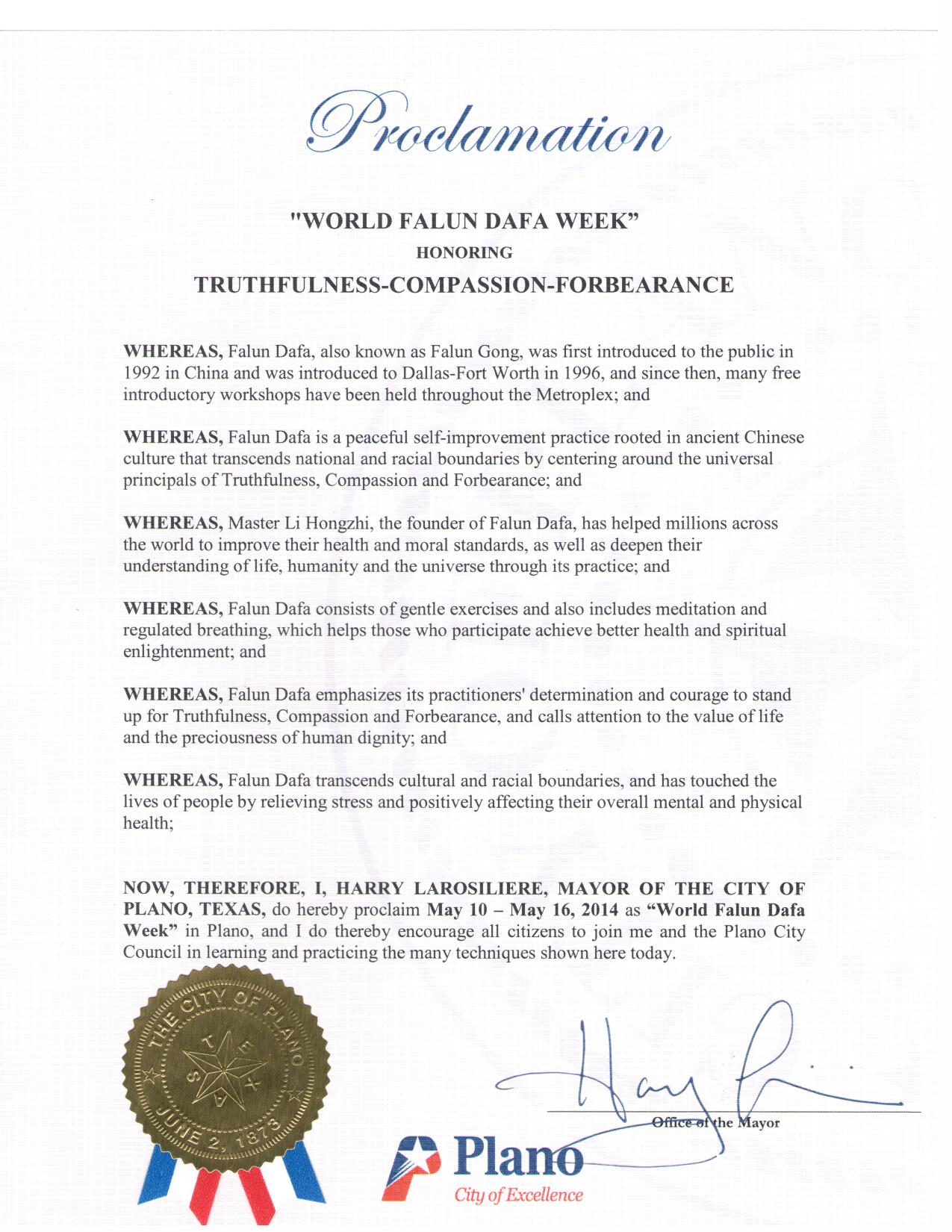 美国德州达拉斯-福特沃斯地区法轮功学员于二零一四年五月十日在布兰诺Russell Creek公园举办活动庆祝世界法轮大法日和法轮大法弘传二十二周年。德克萨斯州弗瑞斯科市(Frisco)市长马赫•马索(Maher Maso)颁发褒奖,宣布五月十日为法轮大法日。 译文如下: 鉴于,法轮大法(法轮功)源于古老中国文化,是以宇宙特性“真、善、忍”为原则的一个平和的自我提高的功法。法轮功共有包括打坐修炼在内的五套功法; 鉴于,法轮大法创始人李洪志先生帮助全世界上亿的人增强身心健康。他们通过修炼法轮功加深了对生命、人生、以及宇宙的认识; 鉴于,法轮大法超越文化和种族的界限,在全世界八十多个国家吸引了上亿人们修炼法轮功。在美国越来越多的人们通过学炼法轮功,使他们心灵得到纯净,身体健康,并为社区道德的回升起着积极的作用; 鉴于,法轮大法从一九九二年在中国传出。一九九六年法轮大法弘传到达拉斯-福特沃斯地区。从那以后,在达福地区的许多图书馆、公园举办了许多期免费法轮大法教功班。法轮大法修炼者参加了许多社区活动; 鉴于,面对中共的残酷迫害,法轮大法学员展现出的对“真、善、忍”的坚定,向全世界展示了生命的价值和人格的尊严; 鉴于,达拉斯-福特沃斯地区法轮大法学员在五月十日在布兰诺Russell Creek公园庆祝世界法轮大法日; 鉴此,我,马赫•马索(Maher Maso),弗瑞斯科市(Frisco)市长,宣布二零一四年五月十日为弗瑞斯科市 法轮大法日马赫•马索(签字) 弗瑞斯科市市长 美国德州布兰诺市宣布法轮大法周德克萨斯州 布兰诺市(City of Plano)市褒奖令颂扬真、善、忍的“世界法轮大法周” 鉴于,法轮大法,又称法轮功,于一九九二年在中国传出。一九九六年法轮大法洪传到达拉斯-福特沃斯地区。从那以后,在达福地区举办了许多期免费法轮大法教功班;并且 鉴于,法轮大法源于古老中国文化,超越文化和种族的界限,是以宇宙特性“真、善、忍”为原则的一个平和的自我提升的功法;并且 鉴于,法轮大法创始人李洪志先生已经帮助世界上的上亿人获得了健康的身体和提升了道德标准,而且通过修炼法轮大法,人们对生命、人类和宇宙有了更深刻的理解;并且 鉴于,法轮大法包括打坐在内的五套缓慢动作,帮助修炼者改善身心健康;并且 鉴于,法轮大法强调修炼者坚定对“真、善、忍”的信念,重视生命的价值和人格的尊严; 鉴于,法轮大法超越文化和种族的界限,修炼者通过修炼获得身心的健康及舒解压力; 因此,我,哈里•拉罗斯里尔(Harry Larosiliere),德克萨斯州布兰诺市(City of Plano)市长,在此宣布二零一四年五月十日至十六日为布兰诺市 “世界法轮大法周”并鼓励所有市民了解并学炼这一功法。 哈里•拉罗斯里尔(Harry Larosiliere) (市长签名) 美国德州南湖市宣布法轮大法日
