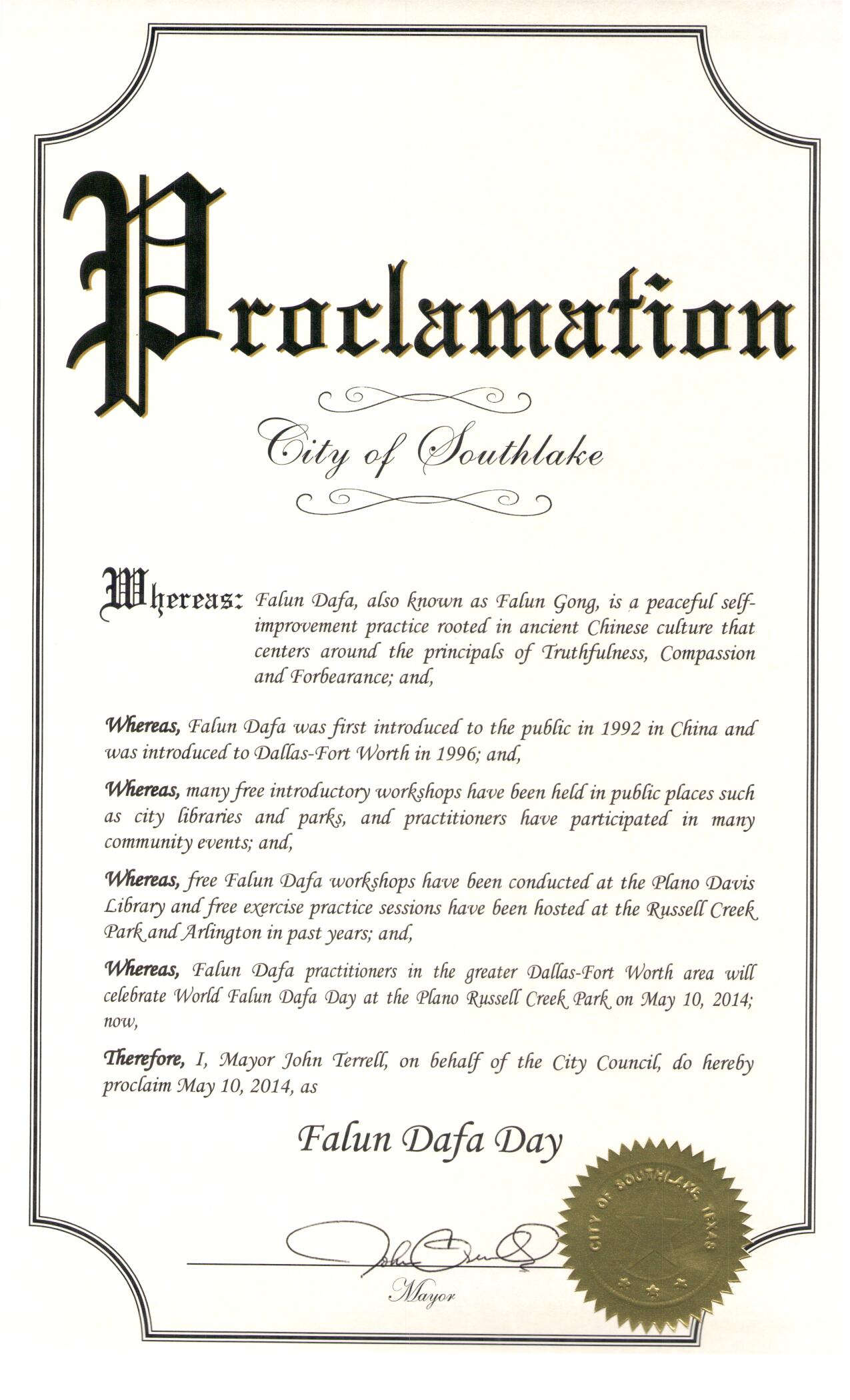 美国德州达拉斯-福特沃斯地区法轮功学员于二零一四年五月十日在布兰诺Russell Creek公园举办活动庆祝世界法轮大法日和法轮大法弘传二十二周年。德克萨斯州南湖市(Southlake)市长约翰•特雷尔(John Terrell)颁发褒奖,宣布五月十日为法轮大法日。 译文如下: 鉴于,法轮大法(法轮功)源于古老中国文化,是以宇宙特性“真、善、忍”为原则的一个平和的自我提高的功法; 鉴于,法轮大法从一九九二年在中国传出。一九九六年法轮大法弘传到达拉斯-福特沃斯地区; 鉴于,许多图书馆、公园举办了许多期免费法轮大法教功班。法轮大法修炼者参加了许许多多社区活动; 鉴于,在过去的几年中,布兰诺大卫图书馆举办了法轮大法教功班。Russell Creek公园和阿灵顿举办了免费的法轮大法教功班; 鉴于,达拉斯-福特沃斯地区法轮大法学员在五月十日在布兰诺Russell Creek公园庆祝世界法轮大法日; 鉴此,我,约翰•特雷尔(John Terrell),南湖市(Southlake)市长,代表市议会宣布二零一四年五月十日为 法轮大法日 约翰•特雷尔(签字) 南湖市市长