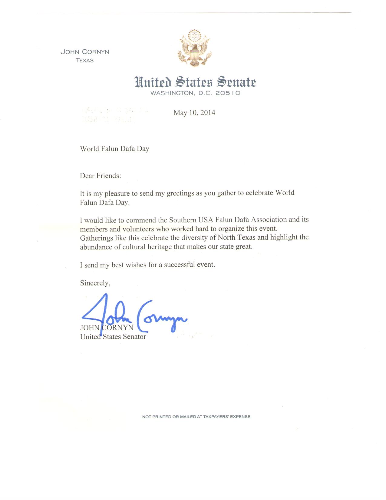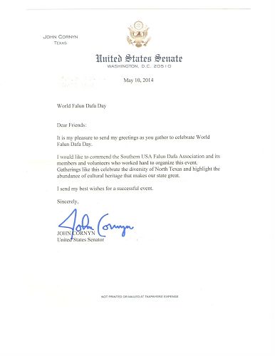 考宁参议员在信中表示,在你们集会庆祝世界法轮大法日之际,请接受我诚挚的祝愿。我感谢美南法轮大法学会和学员们,辛苦的组织这个活动。这次活动也是庆祝北德州的多元性。彰显我们丰富的文化底蕴,使我们德州更伟大。