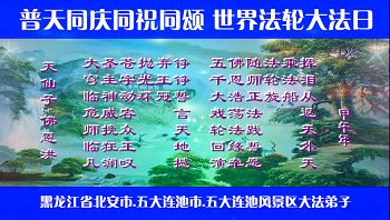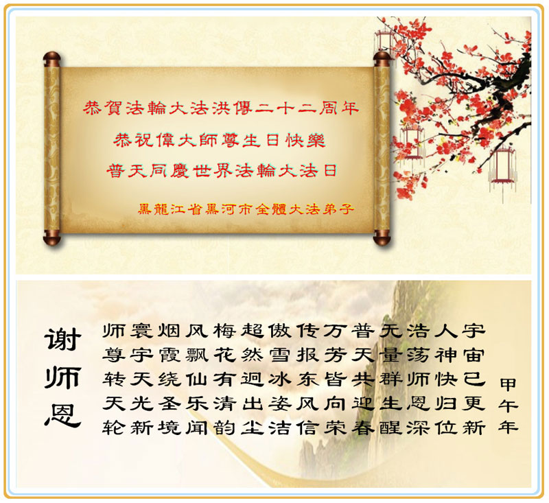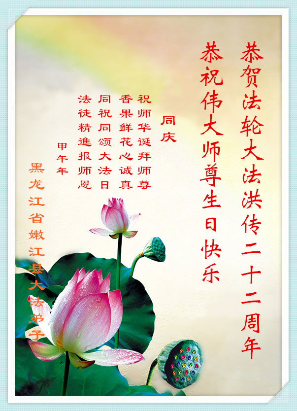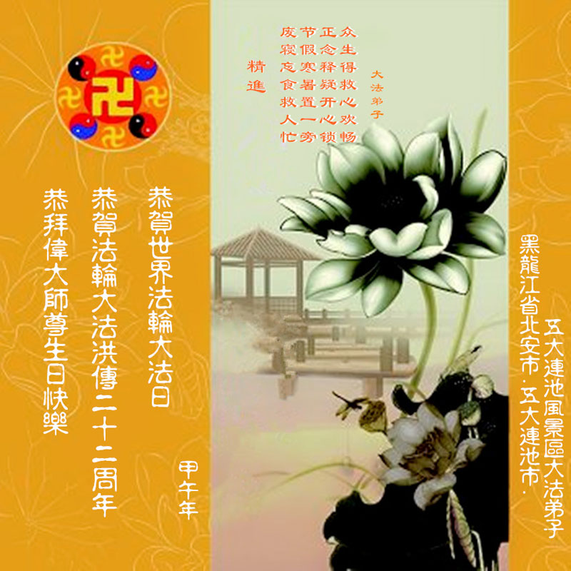 黑龙江省黑河市北安市大法弟子恭祝伟大师尊生日快乐!恭贺法轮大法洪传二十二周年!