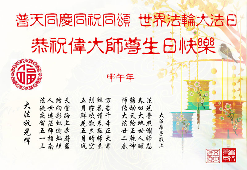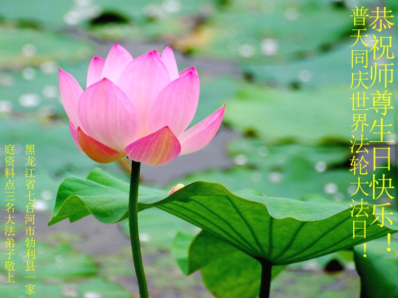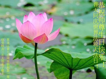 感谢师尊救度之恩!弟子一定走好救度众生、助师正法之路,兑现史前誓约。敬拜师尊! 黑龙江省七台河大法桃山区一学法小组及全家恭祝师尊生日快乐并恭贺法轮大法洪传二十二周年!