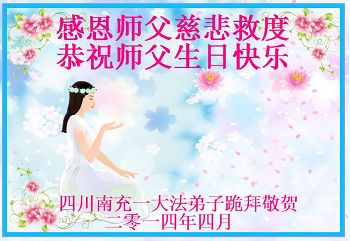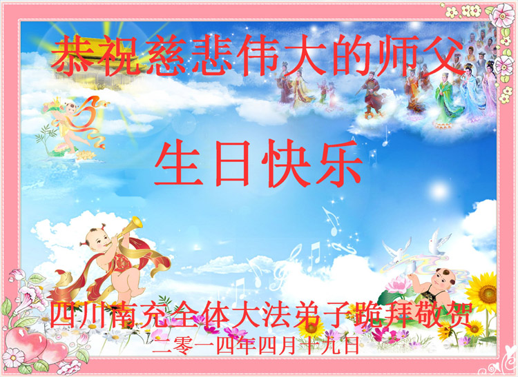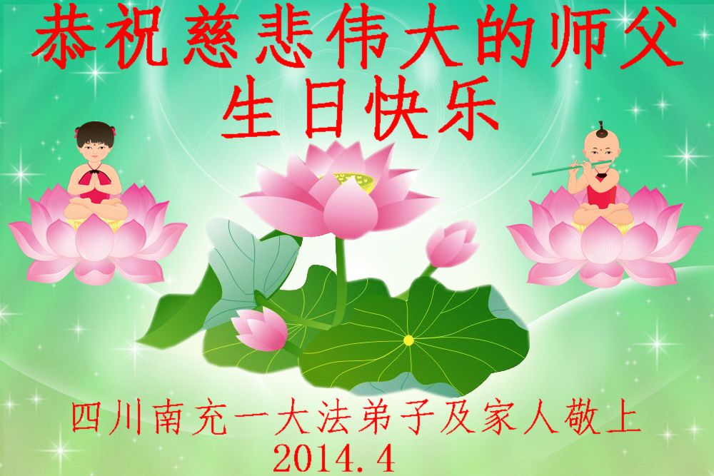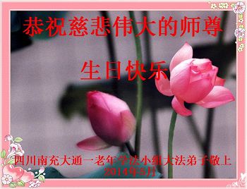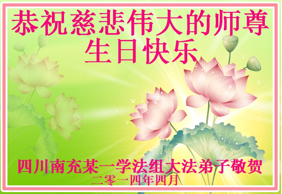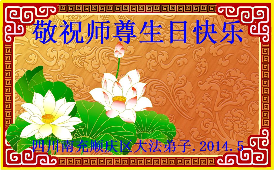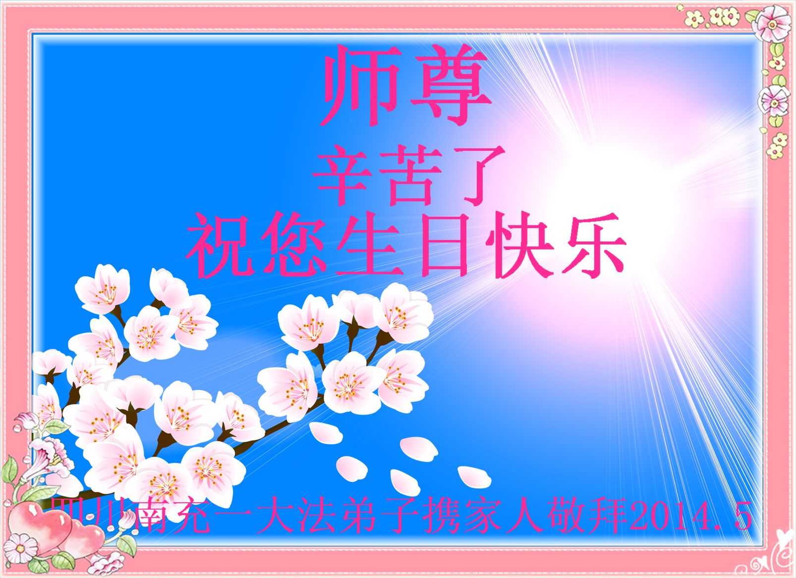 又是一年五一三,正法洪势猛向前 救度众生师尊苦,无量众业师承担 挽救大穹于坏灭,意如金刚挽狂澜 大法洪传旧势阻,螳臂当车自灭亡 弟子紧跟师正法,开创新宇虹满天 今贺师尊华诞日,祝我师尊节日欢 众生感恩喜相告,愿我师尊笑开颜 师愿众生都得救,师愿弟子都圆满 感恩师尊救度苦,呵护弟子过难关 千言万语道不尽,唯有精進不停闲 努力做好三件事,誓完使命随师还 遂宁市大法弟子及家人拜贺 二零一四年四月三十日 四川南充一大法弟子祝师尊生日快乐!