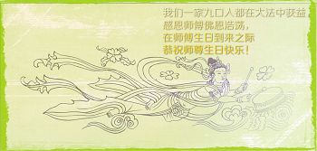 感谢师尊的慈悲苦度!弟子只有更加精進实修,做好三件事,以报师恩。 我代表学法小组大法弟子及全家祝慈悲伟大的师父生日快乐!