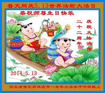 【明慧网二零一四年五月十一日】 河北保定大法弟子恭贺世界法轮大法日!恭祝师尊生日快乐!