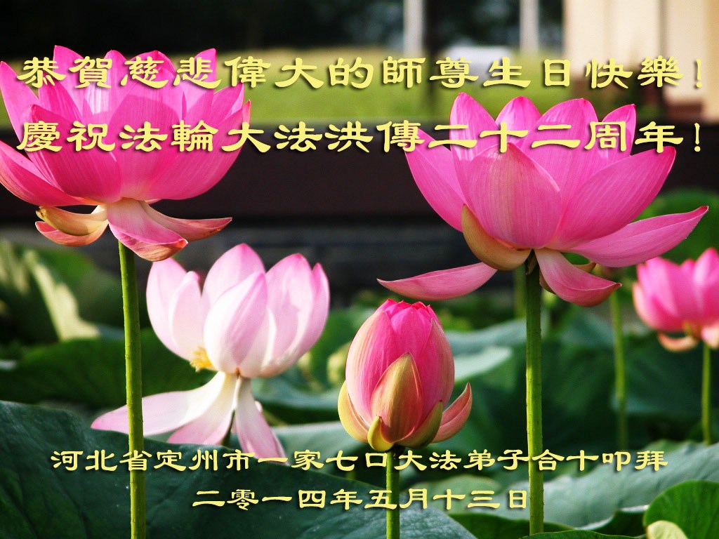 恭贺慈悲伟大的师尊生日快乐! 庆祝法轮大法洪传二十二周年! 庆贺5.13世界法轮大法日! 河北省定州市一家七口大法弟子合十叩拜 河北省保定东关大法弟子祝师尊生日快乐!庆祝世界法轮大法日!