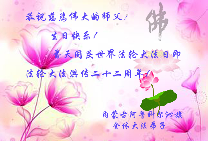 恭贺世界法轮大法日二十二周年! 在十几年的修炼中,弟子跌跌撞撞走到今天,无论在修炼上或在生活中弟子无时不感到师父的慈悲点悟与呵护。弟子无以回报,只有精進实修做好三件事以报师恩。师父您辛苦了。 弟子跪拜师尊! 内蒙古自治区赤峰市阿鲁科尔沁旗全体大法弟子恭祝慈悲伟大的师父生日快乐!