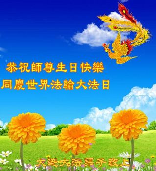 在“世界法轮大法日”即将来临之际,弟子恭祝师父甲午华诞!恭祝师父传法二十二周年!感恩师父把宇宙大法洪传世间,使众生有了回归的指南。在最后的正法路上,弟子一定要精進实修,珍惜这万古机缘。学好法,做好三件事。转观念、添正念,救度有缘人,圆满随师还。 感恩师父慈悲救度! 感恩师父慈悲呵护! 感恩师父慈悲点化! 感恩师父慈悲加持! 辽宁大连大法弟子叩首 辽宁省大连一大法弟子恭祝伟大慈悲的师尊生日快乐!