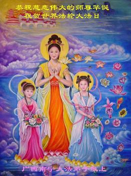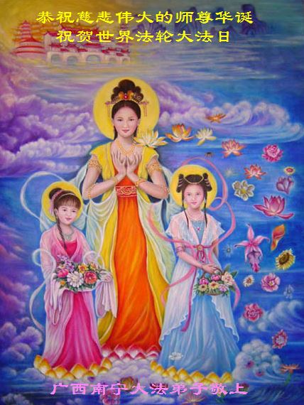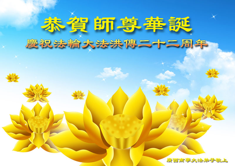 广西博白大法弟子怀着崇高的敬意感谢师尊二十二年来对我们的慈悲苦度。我们一定认认真真做好三件事,决不辜负师尊对我们的慈悲苦度。 广西南宁大法弟子恭祝师尊华诞!恭贺世界法轮大法日!