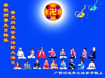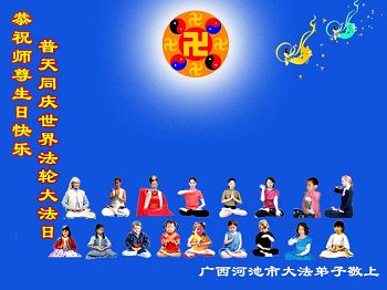 正法的结束时间一再延缓,是师父用巨大的承受才换来的,我们要多学法、学好法,做好三件事,多救人,早日迎回师父。 广西河池市大法弟子恭贺师尊生日快乐!普天同庆世界法轮大法日!