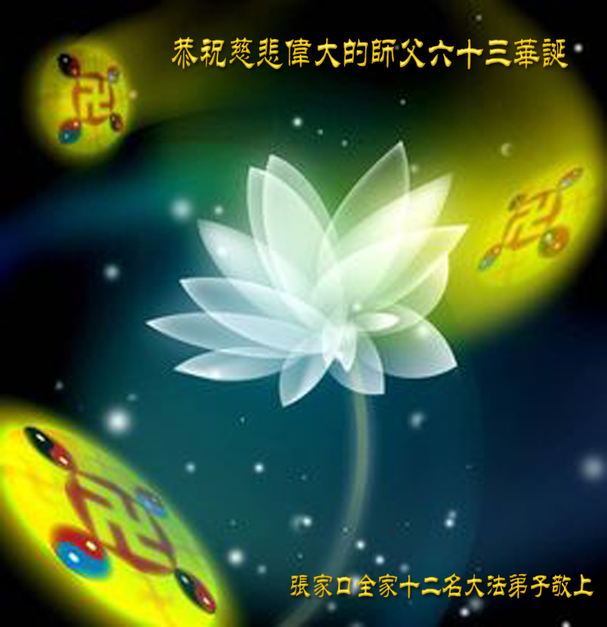 弟子恭贺师父六十三岁华诞,感谢师父慈悲救度,在以后的日子里弟子一定听师父的话多学法,静心学法,多救人兑现史前誓约,圆满随师还。 合十叩拜师尊 河北省蔚县大法弟子学法小组 廊坊大法弟子及全家人、河北省张家口大法弟子及家人恭祝伟大师尊生日快乐!