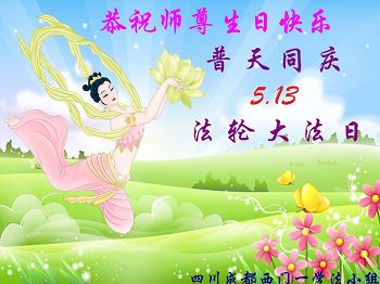 四川省成都大法弟子祝师尊生日快乐!祝贺五一三世界法轮大法日!