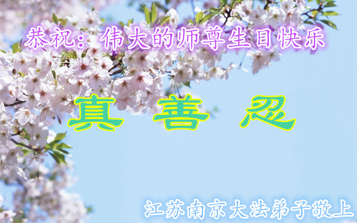 普天同庆第十五届世界法轮大法日暨法轮大法弘传世界二十二周年! 弟子们对慈悲伟大的师尊心怀无限的感恩,在师尊以巨大的付出延续来的宝贵时间中,一定踏踏实实坚定的做好三件事,修好自己、圆容整体、救度众生、兑现史前的誓约,圆满随师还! 江苏省南京市大法弟子恭祝师尊生日快乐!