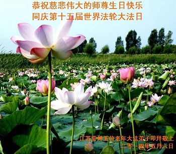 江苏常州五位老年大法弟子:恭祝慈悲伟大的师尊生日快乐!同庆第十五届世界法轮大法日!忆师尊 热泪盁眶 拜师尊 感恩不忘 跟师尊 圆满启航 归正一切重返天堂。 师尊啊!师尊!在这普天同庆的佳节,请接受我们的敬意与感恩。我们一定做好三件事。兑现史前誓约,完成使命。让师尊多一份欣慰,少一份操劳。 江苏常州五位老年大法弟子叩拜敬上 二零一四年五月六日 江苏一家七名大法弟子恭祝师尊生日快乐!法轮大法好!
