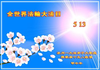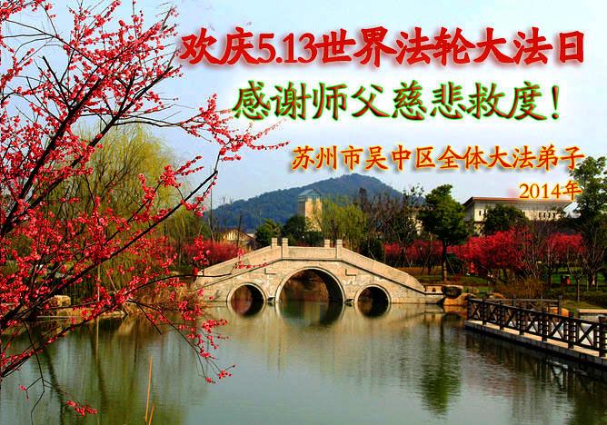 江苏省靖江市一大法弟子恭祝师尊六十三华诞!普天同庆5.13世界法轮大法日暨大法洪传二十二周年! 感恩师尊的慈悲苦度!在正法最后的日子里,弟子们一定做到百分之百信师信法,师父怎么说我们就怎么做,放下自我,互相配合,努力做好三件事,跟师父回家! 江苏省靖江市一大法弟子跪拜 2014年5月4日 江苏省苏州市吴中区全体大法弟子欢庆5.13世界法轮大法日!感谢师父慈悲救度!