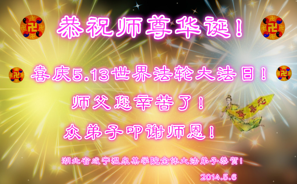 双喜临近,同喜同贺同祝;恭贺师尊华诞!喜庆5.13世界法轮大法日! 湖北省咸宁市温泉乡镇大法弟子一学法小组全体同贺 湖北省随州市广水市大法弟子恭贺师尊华诞暨世界法轮大法日!
