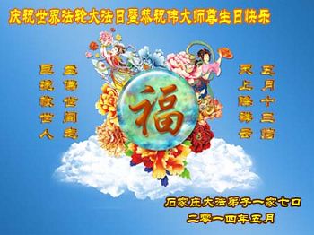 师尊,您好! 恭祝慈悲伟大的师尊生日快乐! 普天同庆5.13世界法轮大法日! 感恩师尊慈悲苦度!弟子想念您! 石家庄市卓达花园书香园大法弟子全家敬拜 河北省石家庄一学法小组大法弟子恭祝慈悲伟大的师尊生日快乐!