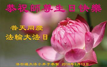 【明慧网二零一四年五月十一日】 美国洛杉矶全体大法弟子恭祝师尊生日快乐!普天同庆法轮大法日!