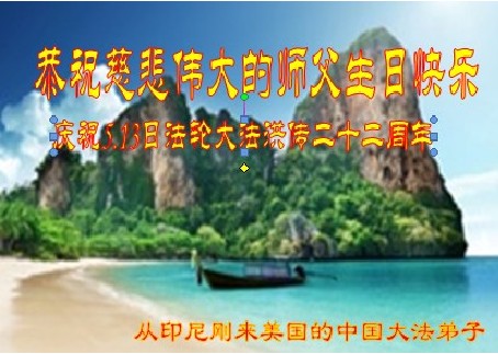 从印度尼西亚刚来美国的中国大法弟子恭祝慈悲伟大的师父生日快乐!庆祝大法洪传22周年!