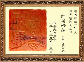 普天同庆五一三世界法轮大法日 “师恩浩荡” 和田石篆刻阴文 吉林省长春大法弟子 吉林省长春市农安县全体老年大法弟子恭祝师尊华诞快乐!