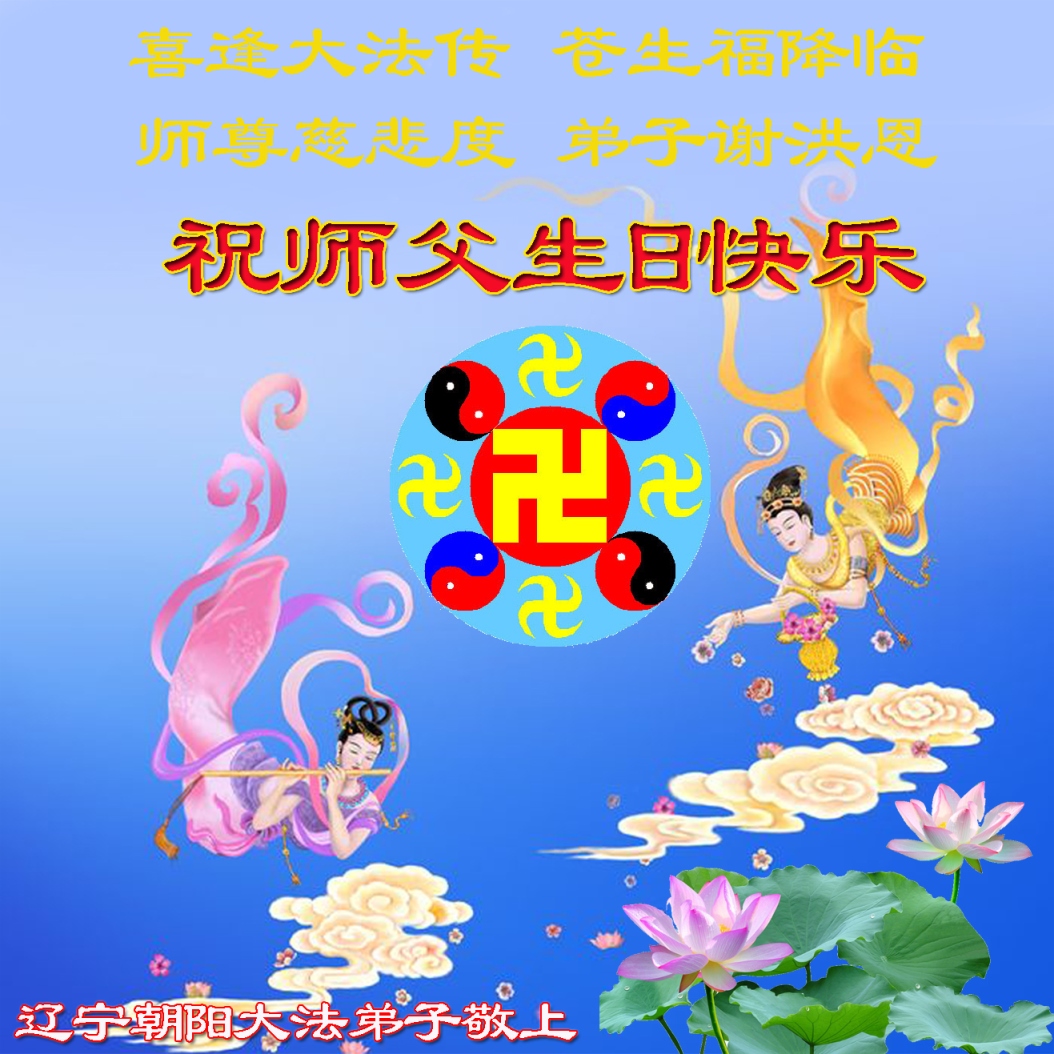 普天同庆大法洪 正法洪势扫大穹 主佛威严光新宇 大法智慧转法轮 法徒助师推法船 乘风破浪救众生 直至佛法洪圆满 慈悲师父笑盈盈 辽宁朝阳大法弟子衷心祝愿师尊生日快乐!