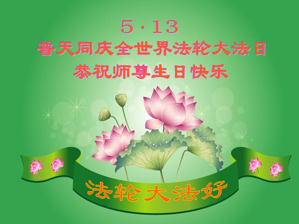 在513世界法轮大法日即将到来之时,我们怀着无比激动的心情,和全世界大法弟子一起欢庆这个伟大的节日!是真、善、忍伟大佛法为世人开创了一切,使人类有了正的能量,世人无不感谢师尊的救度之恩! 作为大法弟子非常感恩伟大师尊传给我们宇宙大法!在佛恩浩荡下我们不断的归正、成长、成熟。在助师正法、履行大法弟子的誓约上,做着我们该做的一切。在证实法的路上时时都感到师尊就在我们的身旁边,引领着我们走好正法之路,呵护着我们正念正行不受迫害。千言万语无法表达对师尊的感恩之心!在此叩谢师尊!恭祝师尊生日快乐! 中国辽宁朝阳大法弟子 2014年5月3日 辽宁省朝阳市建平县全体大法弟子恭祝慈悲伟大的师尊生日快乐!