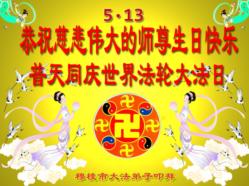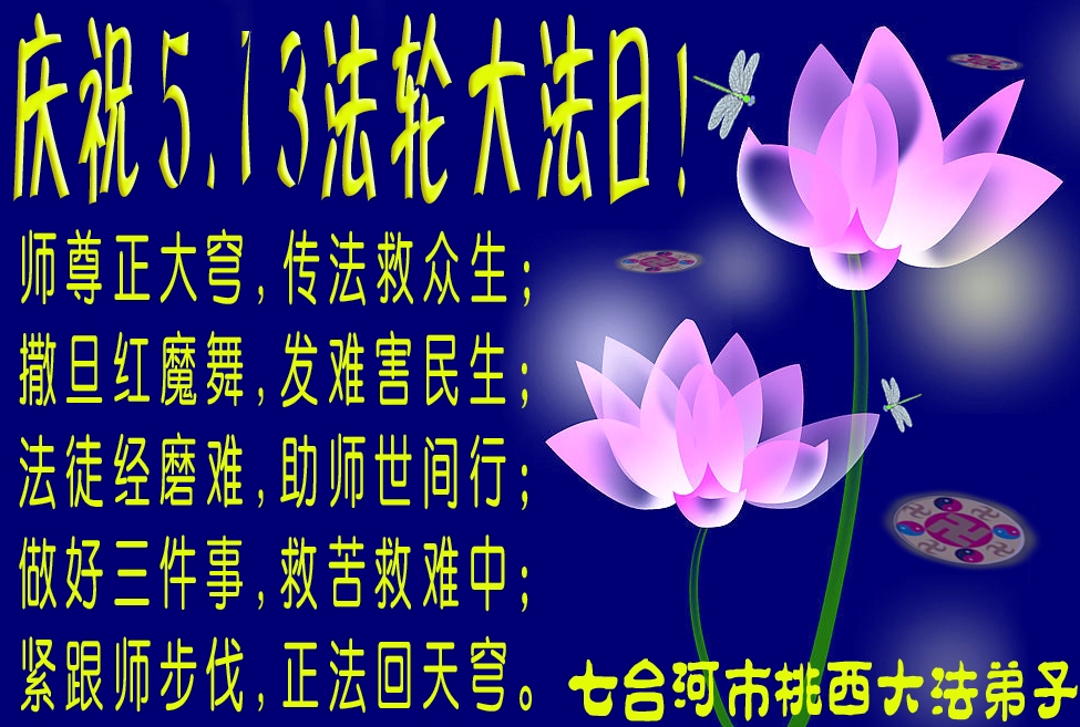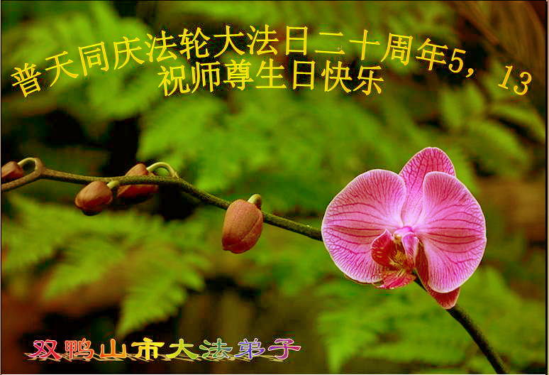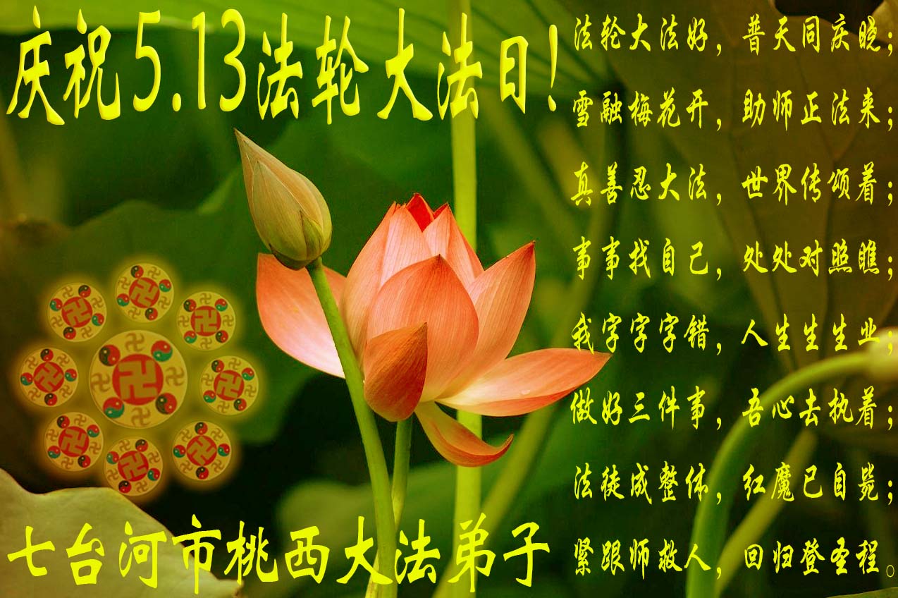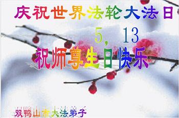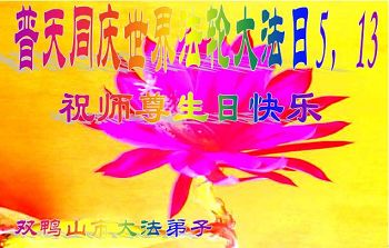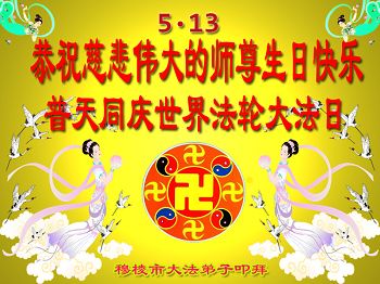 大法徒 普天同庆五一三, 大法开传到人间。 神州众生先得法, 久远洪愿万古缘。 大法洪传全世界, 得法之士非等闲。 代表众生同化法, 得法洪法走在前。 修己救人证实法, 法正人间大团圆。 黑龙江双鸭山市大法弟子敬贺 2014年5月5日 黑龙江省七台河大法弟子恭祝师尊生日快乐!