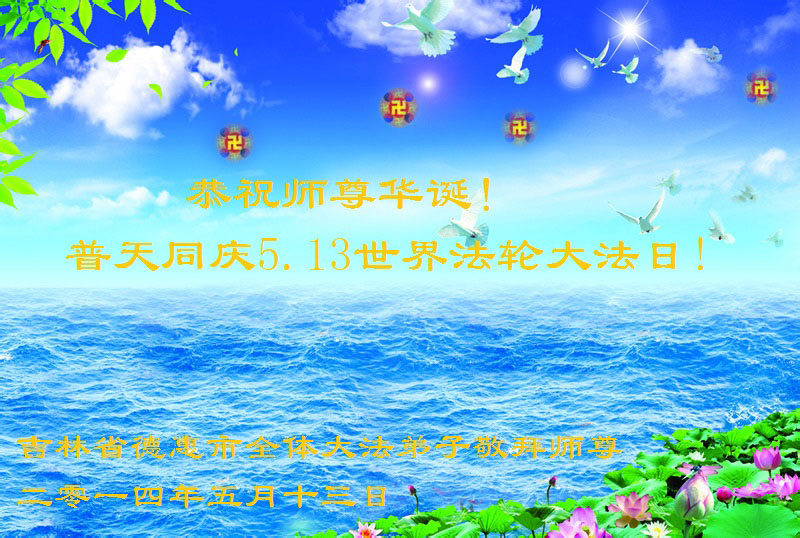 【明慧网二零一四年五月十二日】 吉林省长春市德惠市大法弟子恭贺师尊生日快乐!普天同庆世界法轮大法日!