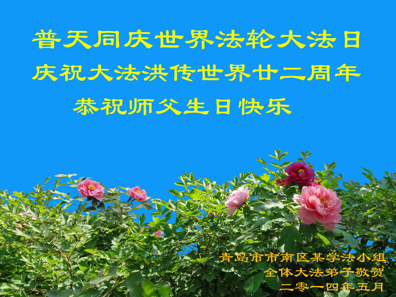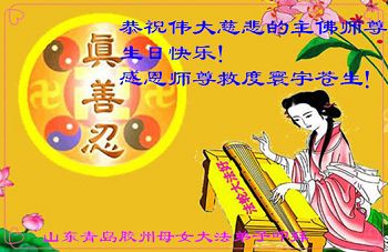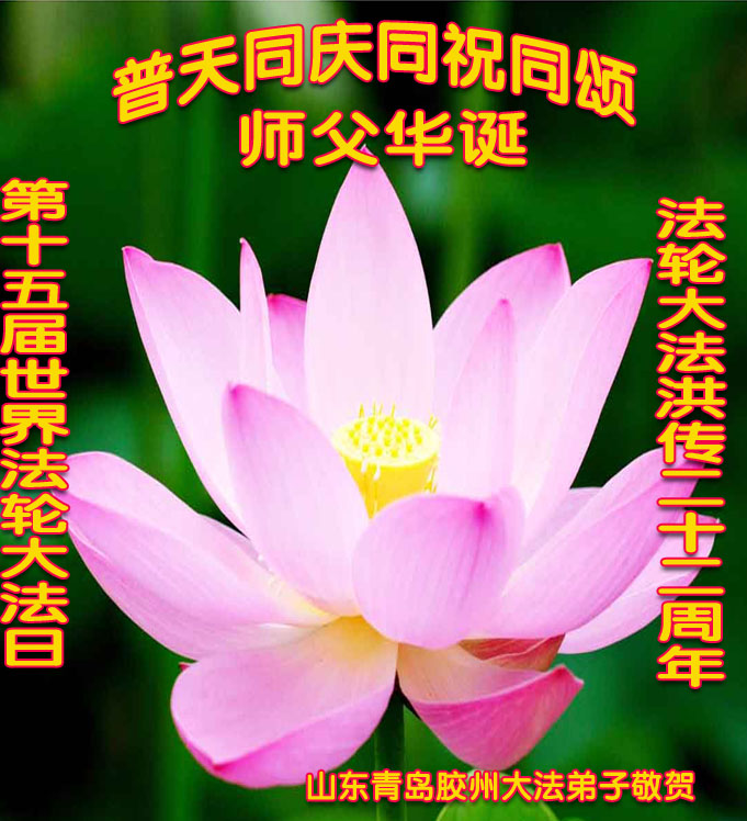 全体山东省青岛大法弟子恭祝慈悲伟大的师尊生日快乐!恭贺世界法轮大法日!