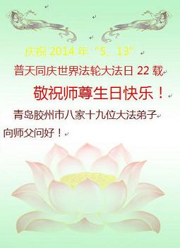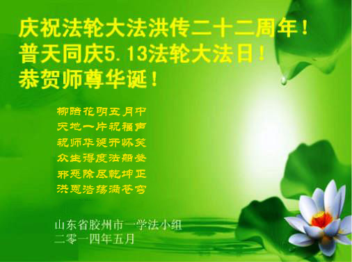 山东省青岛市胶州市大法弟子祝贺5.13世界法轮大法日!恭贺师尊华诞!