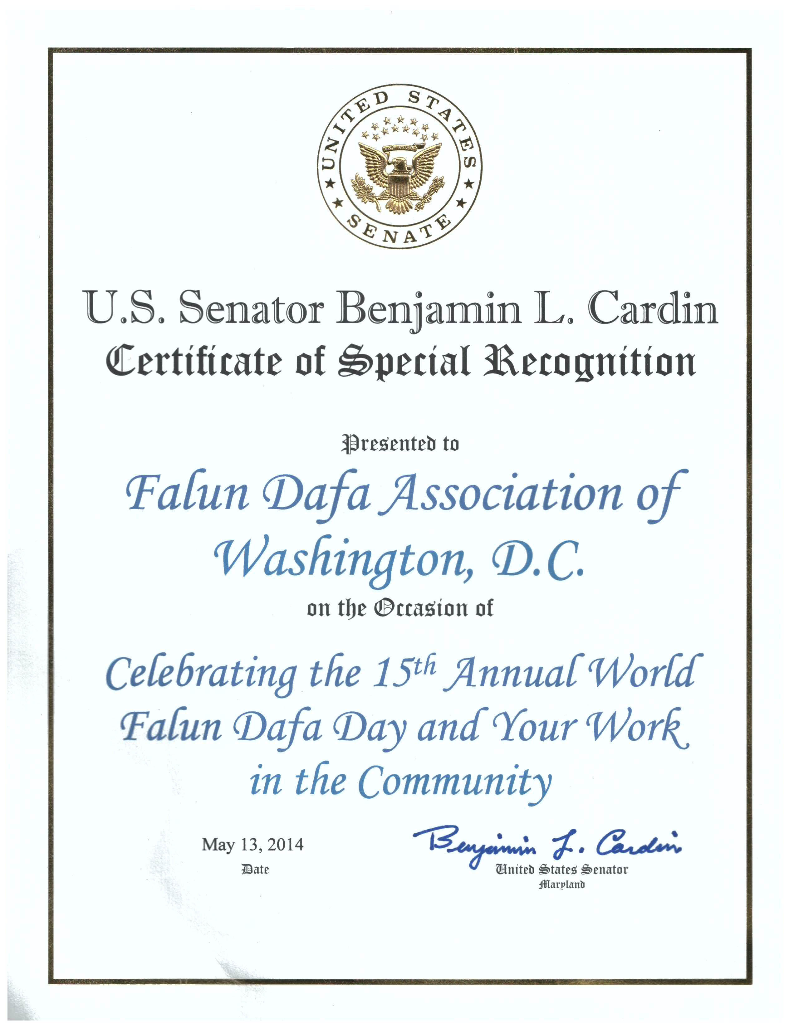 十日中午,美国国会山前的游客络绎不绝,法轮功学员的炼功场面吸引很多游客驻足观看并拍照留念。在宇航馆前,二十多块展板和横幅向人们展示法轮大法洪传世界的盛况以及中共迫害法轮功的真相。 在大华府地区的法轮功学员庆祝第十五届世界法轮大法日之际,美国联邦参议员本•卡丁向华盛顿DC法轮大法学会颁发特别奖励证书,同时表彰他们对社区的贡献。  美国联邦参议员本•卡丁向华盛顿DC法轮大法学会颁发特别奖励证书 |
