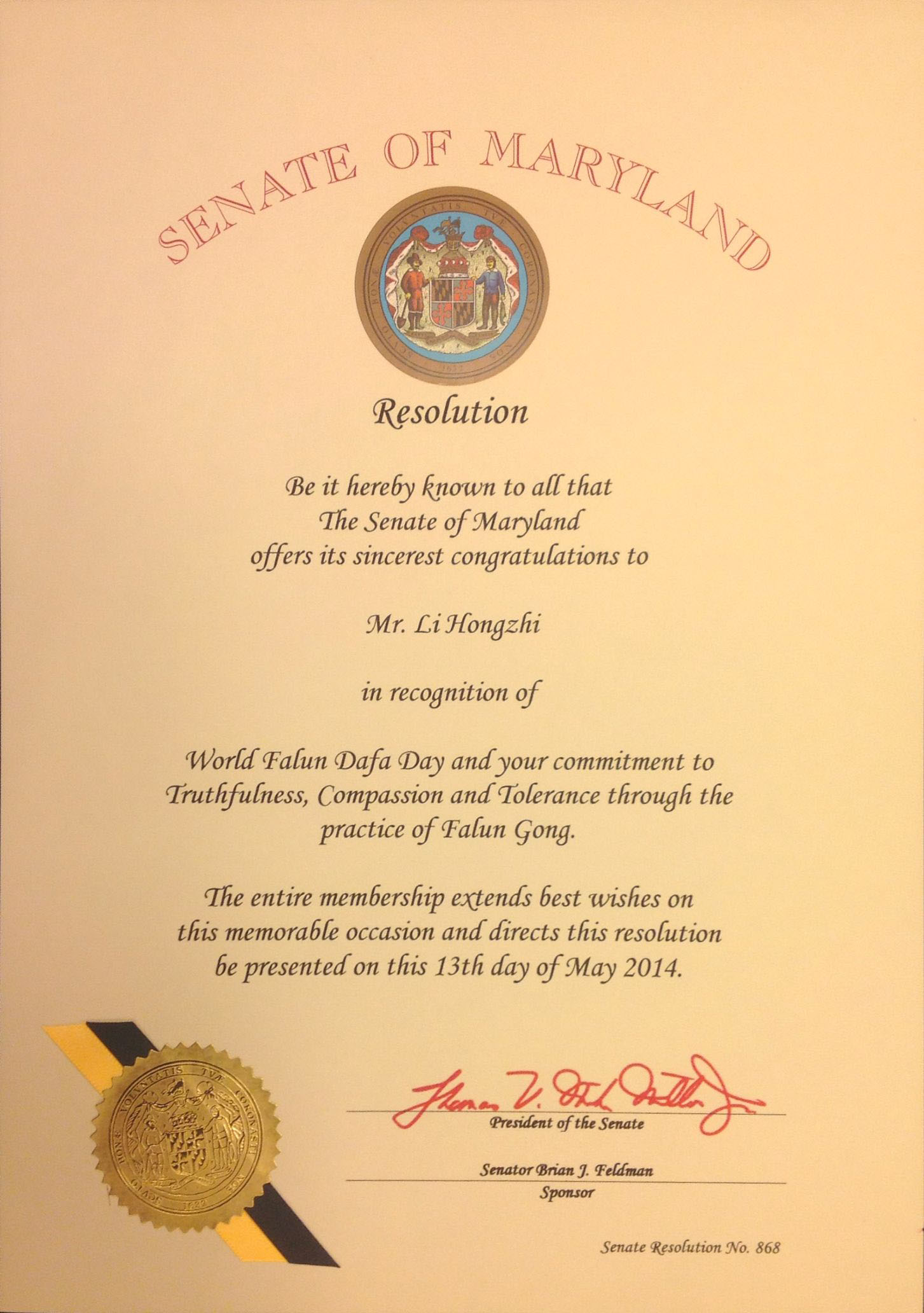 马里兰州参议院通过了八四一号决议案,马里兰州众议院通过了五二四号决议案,向李洪志先生致以最诚挚的祝贺,表彰世界法轮大法日。  马里兰州参议院通过的八四一号决议案 |