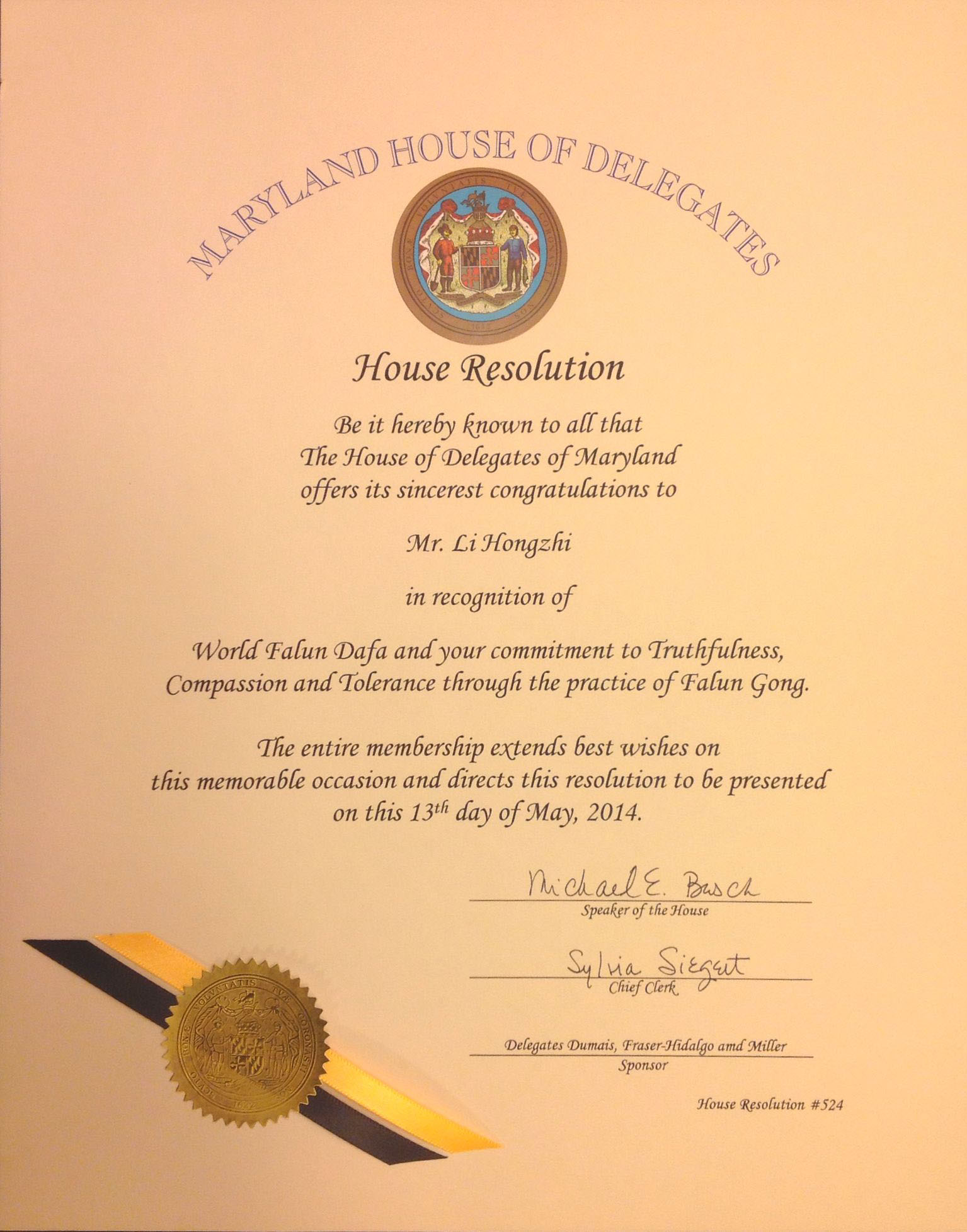 五二四号决议案译文如下: 马里兰州众议院 决议特此公告 马里兰州众议院向李洪志先生致以最诚挚的祝贺,表彰世界法轮大法日以及通过修炼法轮功,你们对真、善、忍的信仰。 在这个值得纪念的时刻,全体众议院成员献上最美好的祝愿。特于二零一四年五月十三日通过此决议。 马里兰州众议院议长:迈克尔•布希(Michael E. Busch) 首席秘书塞尔维亚•西格特(Sylvia Siegert)