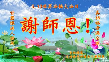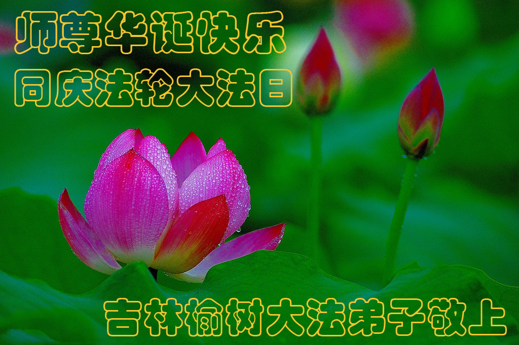 有感《五一三》 握笔凝思心潮起, 万千思绪荡心堤, 有感五一三法轮大法日, 回眸修炼史颂恩师。 二十二载大法洪传, 二十二载甘露灌溉, 二十二载脱俗超凡, 二十二载莲花盛开。 主佛慈悲归正大穹, 佛恩浩荡万物苏醒, 明白真相得救有望, 修炼使人道德回升。 大法贯通层层穹宇, 众生得救法理破迷, 师尊导航主掌天地, 法徒紧随兑现大誓。 铸就真身熔炼金体, 树威德师尊盼我们成器。 一次次给机会让我们修成自己, 巨难中“弟子正念足 师有回天力”。 慈悲的主佛!伟大的师尊! 在您六十三岁寿诞的日子里, 在法轮大法洪传二十二周年之际, 弟子跪拜行大礼!九叩谢恩师!! 恭祝师尊生日快乐无比! 长春十六名大法弟子 二零一四年四月二十八日 吉林省长春大法弟子全家恭祝慈悲伟大的师尊生日快乐!