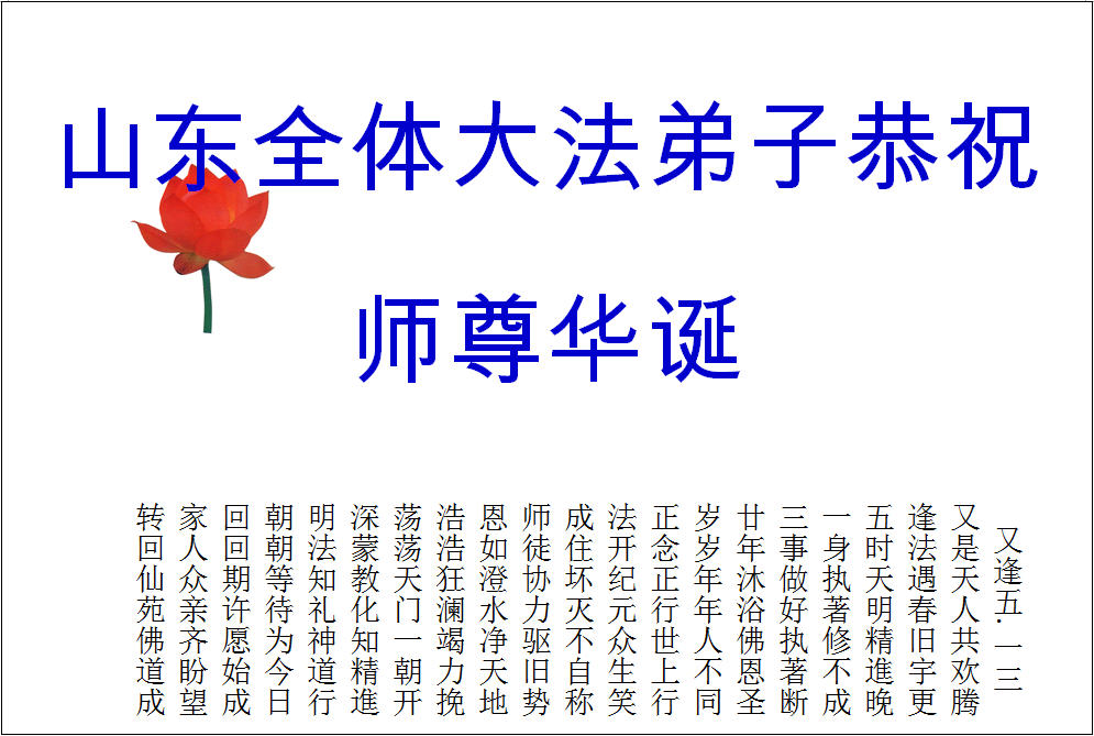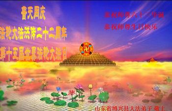 山东省滨州市博兴县大法弟子祝师父生日快乐!普天同庆法轮大法洪传22周年暨世界法轮大法日!