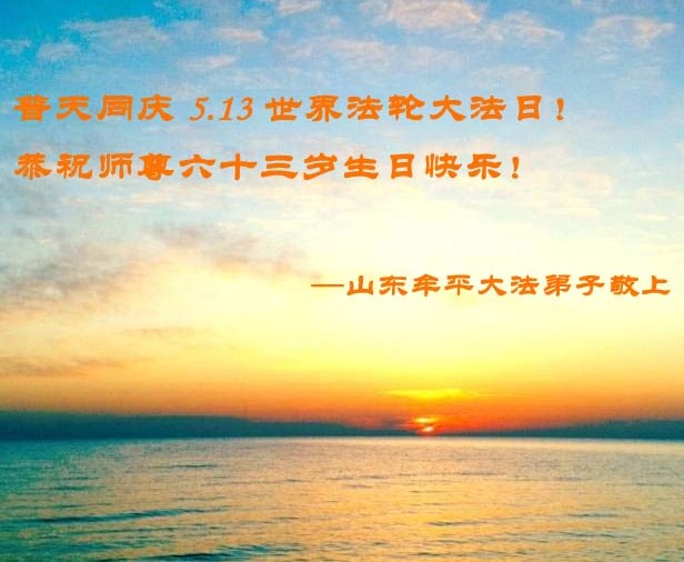 山东牟平大法弟子普天同庆世界法轮大法日!恭祝师尊生日快乐!
