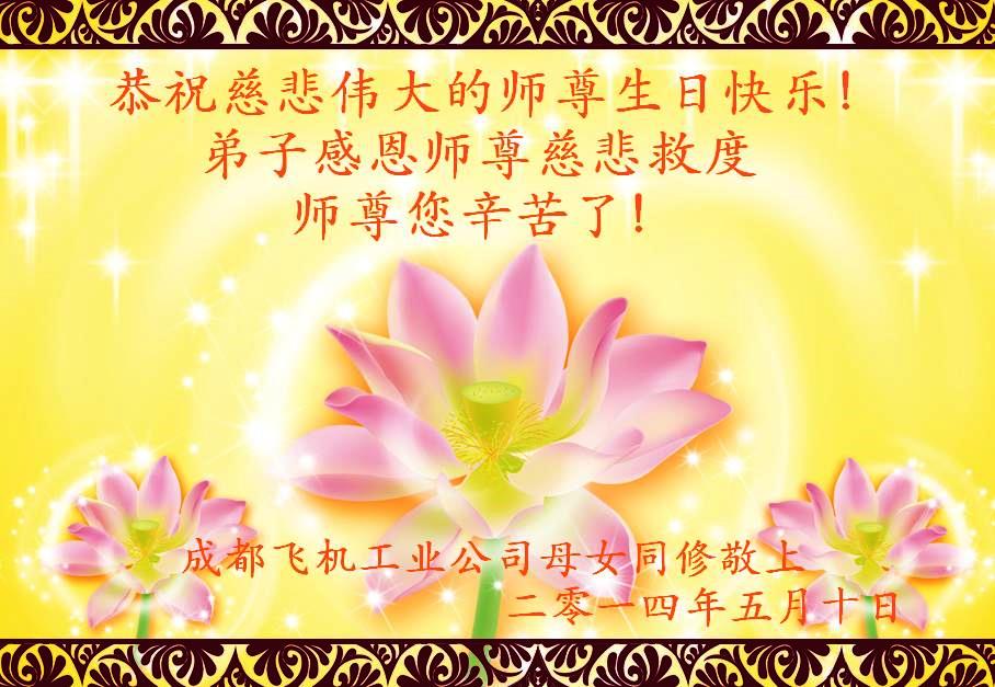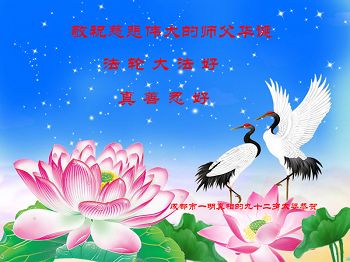 师尊您好!弟子成为宇宙大法弟子,真正感到无限的荣耀与幸福。师尊的无限艰辛与操劳,我都沐浴在您的佛光中,感受法轮大法的洪恩,弟子无以为报,在正法的最后时刻抓紧救人,做好三件事,随师回家园。跪拜师尊! 四川省成都飞机工业公司母女大法弟子恭祝慈悲伟大的师尊生日快乐!