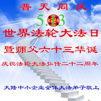 大陆中小企业全体大法弟子普天同庆世界法轮大法日暨师父华诞!庆祝大法洪传22周年!