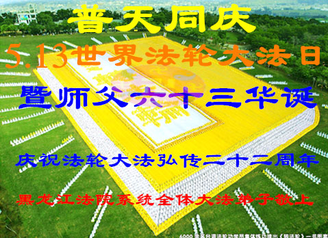 黑龙江法院系统全体大法弟子普天同庆世界法轮大法日暨师父华诞!庆祝大法洪传22周年!