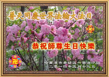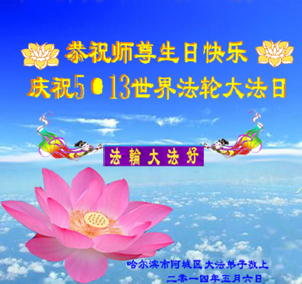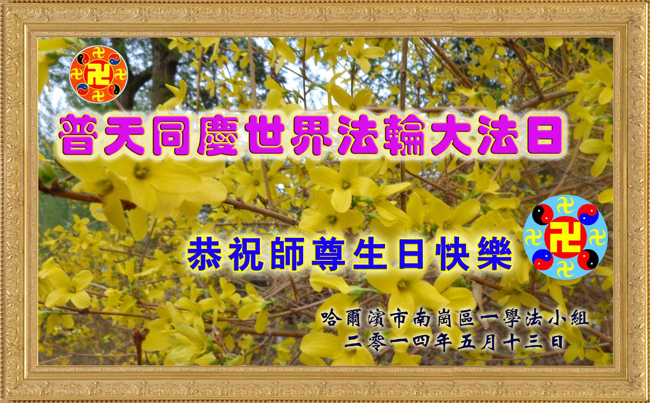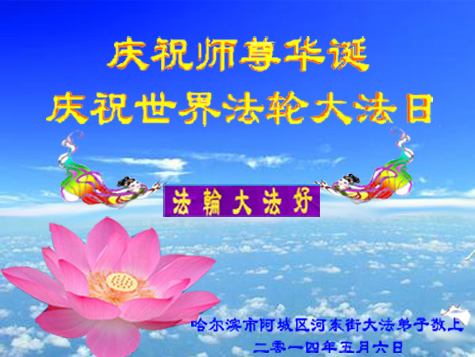 【明慧网二零一四年五月十三日】 黑龙江省哈尔滨大法弟子普天同庆世界法轮大法日!祝师尊生日快乐!