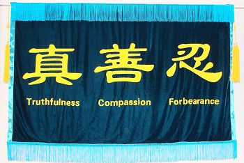 注:她是用金丝绒布料(宽185CM高112CM)和黄色的绒布做成的字结合而成,又加上丝边和排穗,做工有传统的布贴画工艺和绣花工艺。 吉林省长春市榆树市个体商店全体大法弟子庆祝法轮大法洪传22周年!