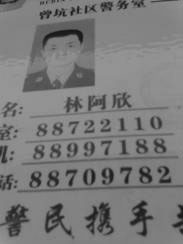 石狮市宝盖镇派出所林阿欣,办公室电话:0595-88722110 手机:0595-88997188 电话:0595-88709782 林剑艺,手机:0595-83110099 电话:0595-88712782