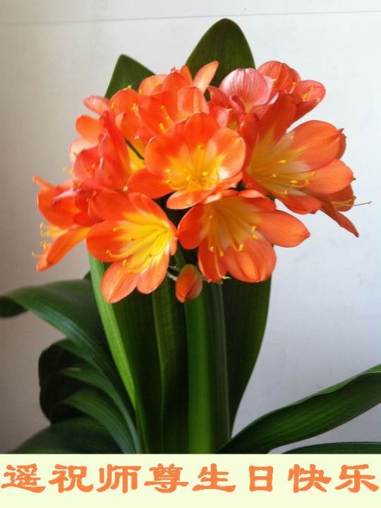 我是九六年得法的老弟子,今年七十四岁。十八年的修炼中听师父的话,把自己当作一个修炼人,坚持学法、抄法、背法和参加集体学法。我还没有见过师父,却深切的到感受师父就在身边呵护着我,使我在邪恶的迫害中坚定正念不迷失;巨难百苦中坚贞不渝不动摇;助师正法中不懈怠,跟着师父一路走过来,在这正法最后的不多的时间里更加勇猛精進,按照师父要求做好“三件事”,多救人。 在这法轮大法日暨师父六十三华诞之际,弟子携小弟子及明真相的家人,我的兄弟姐妹们一家子十二人叩谢师尊慈悲救度之恩。 家乡弟子想念师尊,盼师尊早回故乡! 抹去泪水,振作精神,走出去救人,救人,多救人,圆容师尊所要的,让师尊多一份欣慰,少一份操劳,惟愿师尊笑、笑、笑。 祝慈悲伟大的师父生日快乐!这是一株盛开的君子兰,遥祝师尊生日快乐! 吉林省长春大法弟子祝师尊生日快乐!