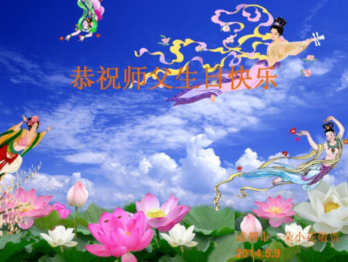 四川都江堰大法弟子三口一家,敬祝伟大的师尊生日快乐!同庆师尊传法二十二周年第十五届法轮大法日,在这欢庆的日子里弟子更想念师尊,请师尊放心,弟子决心要走好以后的路,不论以后路有多艰险,我一定要跟师尊走下去,遵循师父的教诲,做好三件事,兑现自己史前誓约,圆满随师还。 弟子敬上 2014年4月26日 四川省成都一老年大法弟子恭祝师尊生日快乐!贺法轮大法日!