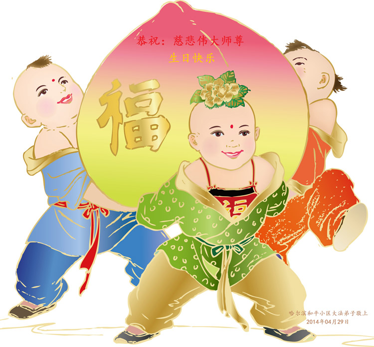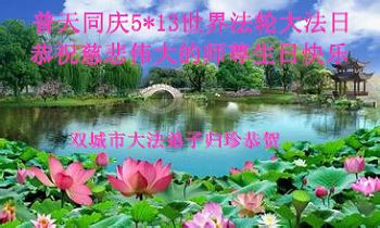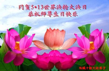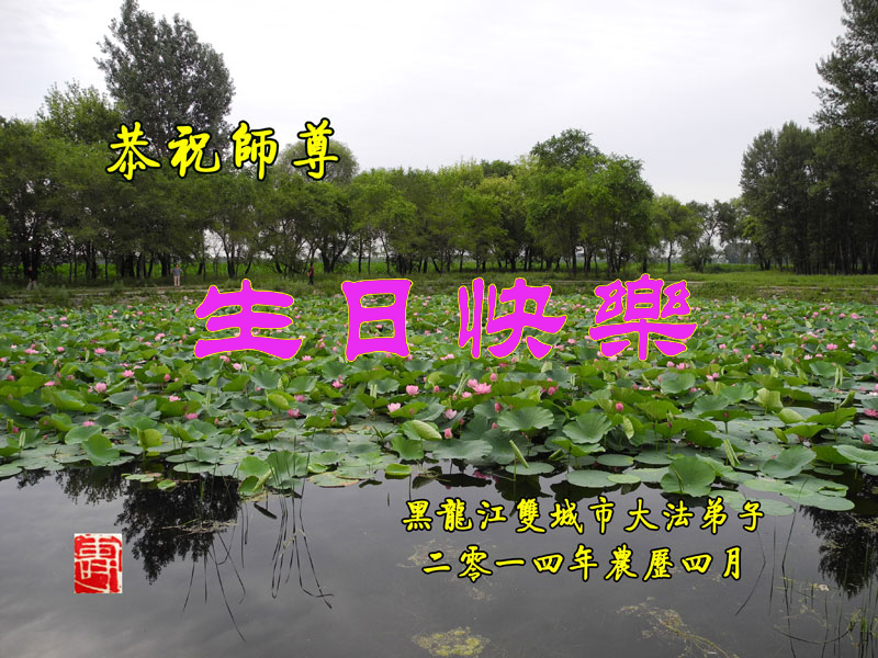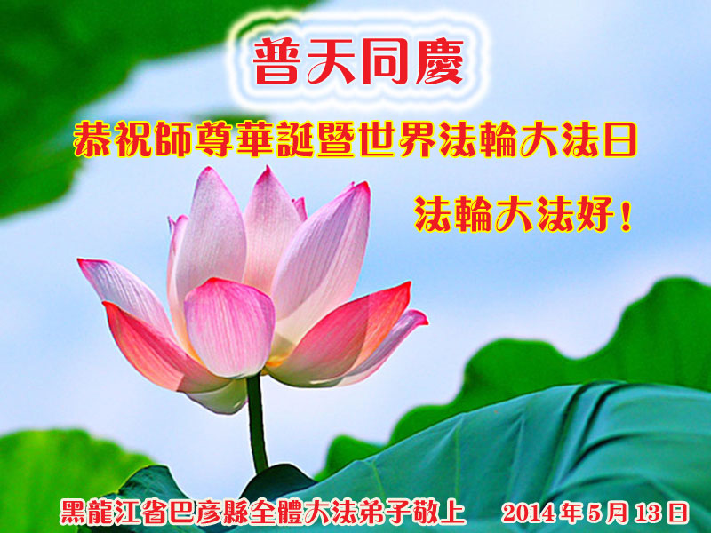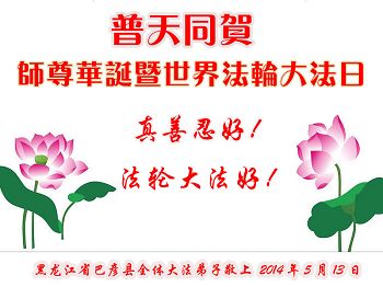 【明慧网二零一四年五月九日】 黑龙江省哈尔滨和平小区大法弟子恭祝慈悲伟大的师尊生日快乐!