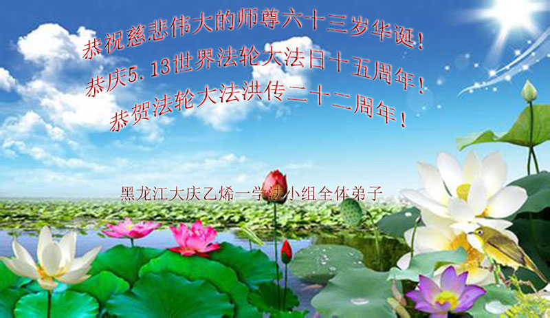 黑龙江大庆乙烯一学法小组全体大法弟子恭祝慈悲伟大的师尊华诞!普天同庆世界法轮大法日暨法轮大法洪传二十二周年!