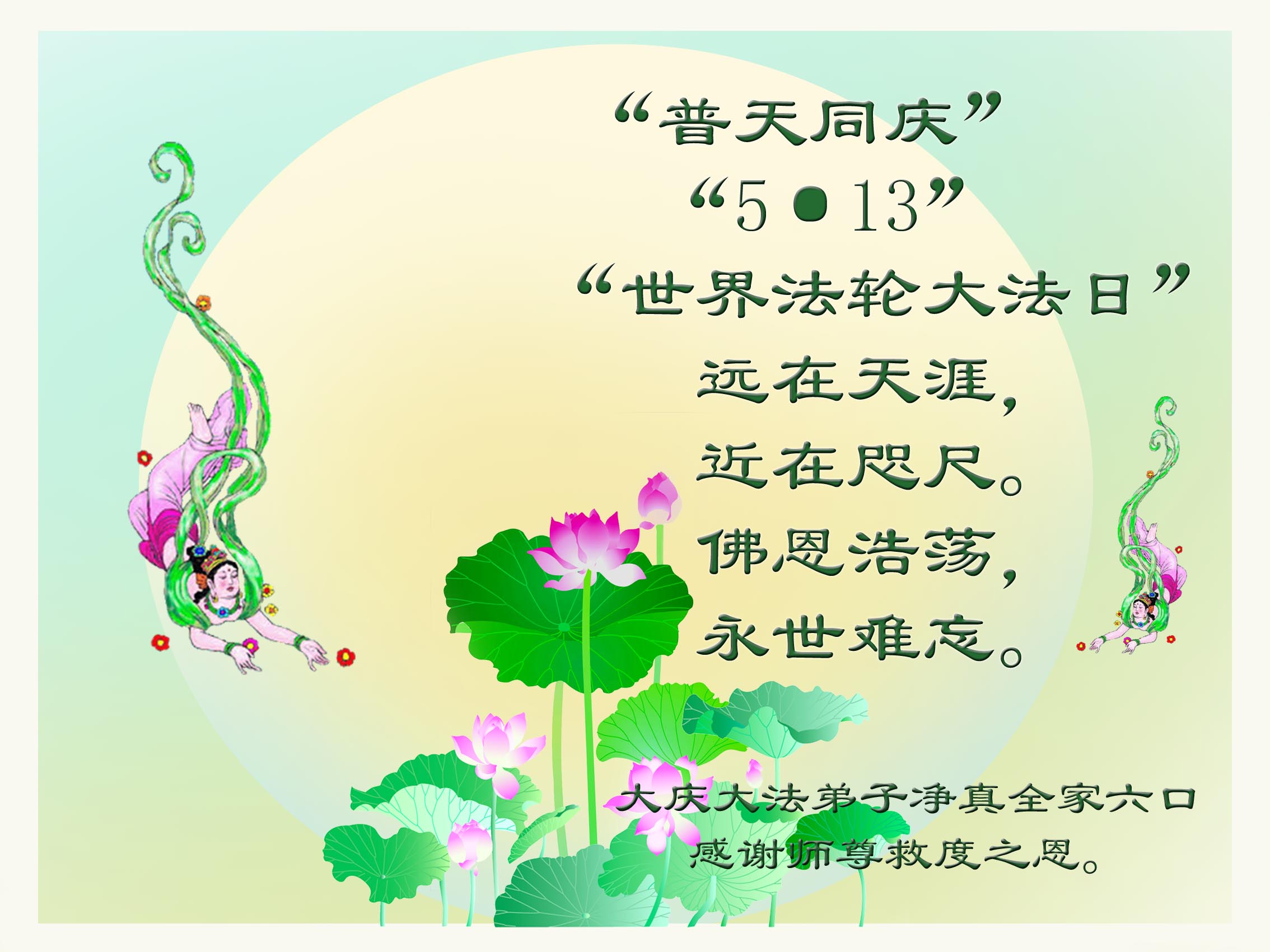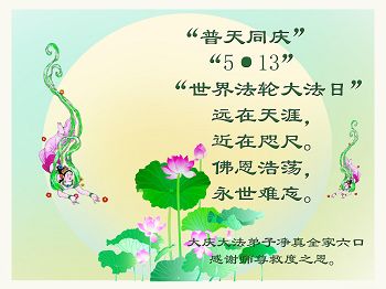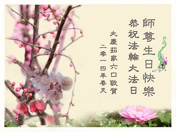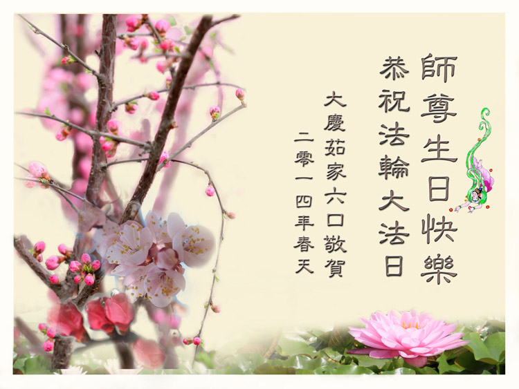 远在天涯, 近在咫尺。 佛恩浩荡, 永世难忘。 感谢师尊救度之恩。 大庆大法弟子全家六口 合十 2014/4/30 黑龙江省大庆地区全体流离失所大法弟子恭祝师尊生日快乐!恭贺世界法轮大法日!