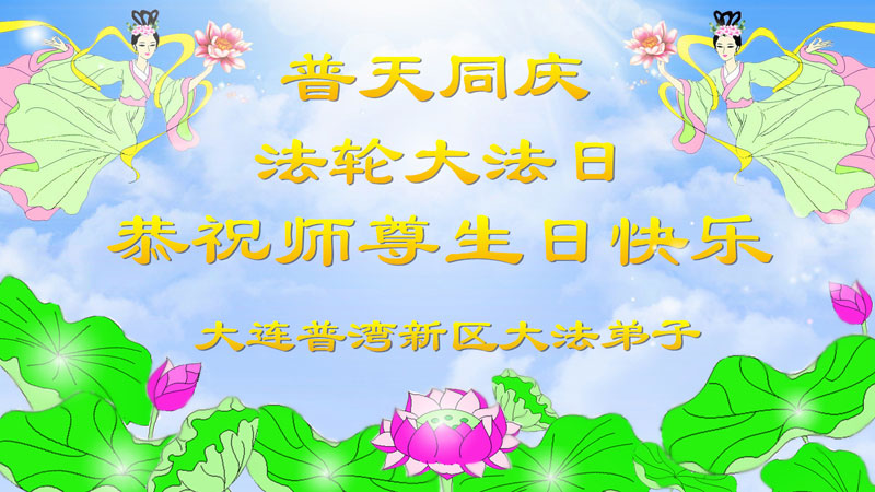 辽宁省大连普湾新区大法弟子恭祝慈悲伟大的师尊生日快乐!欢庆世界法轮大法日十五周年!