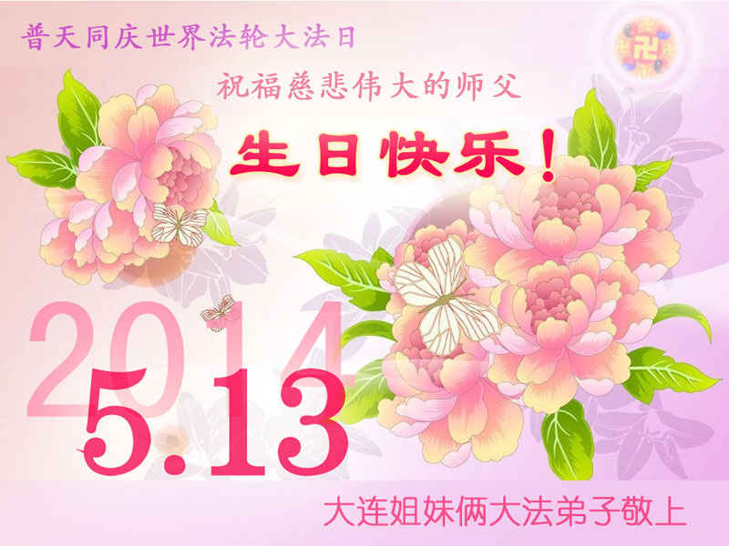 辽宁省大连姐妹俩大法弟子祝福慈悲伟大的师父生日快乐!普天同庆世界法轮大法日!